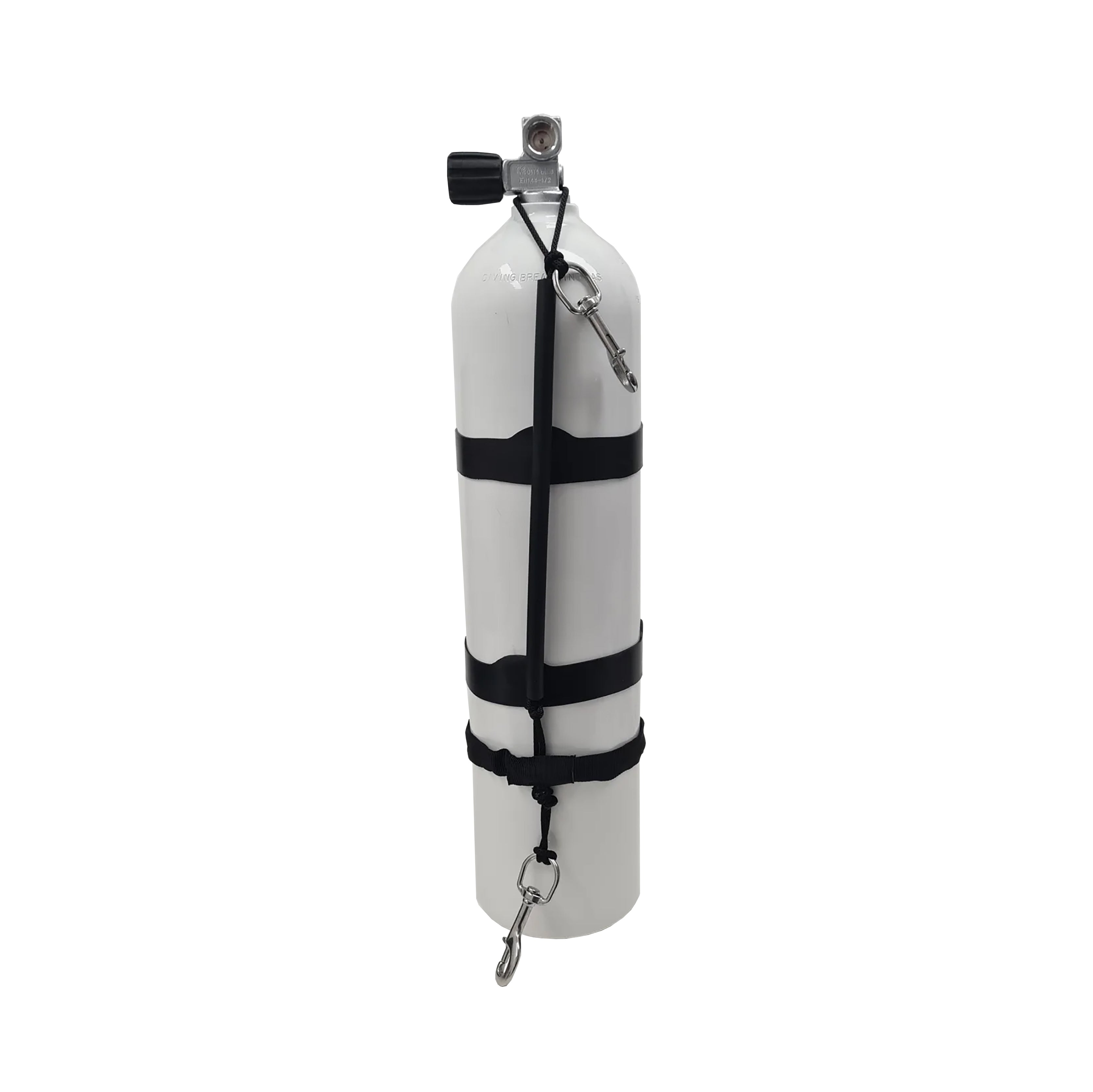 Flasken leveres som standard med en italiensk kvalitetsventil med M25x2 flaskegevind og 230 bar udtag, kompatibel med både 5/8" DIN og INT via tilkøb af indsats. Ventilen har et ekstra langt gummihåndtag for bedre greb, og hele sættet er forberedt til oxygen efter korrekt cleaning, hvilket gør det ideelt til brug i teknisk dykning, herunder dekompressions- og stagegas.