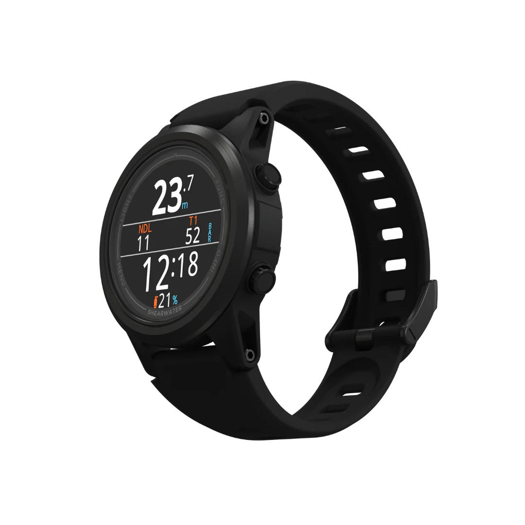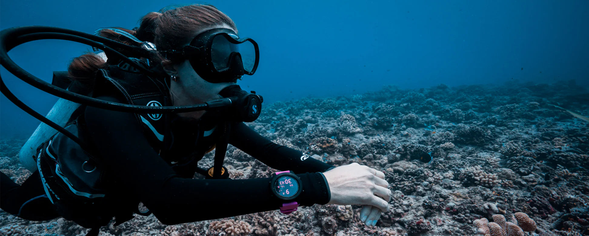 Det klare AMOLED-display i fuld farve og høj kontrast gør det let at aflæse information, selv i lav sigtbarhed eller ved dyb dykning. Skærmen er beskyttet af hærdet glas, og batteriet holder op til 20 timer ved almindelig brug – med trådløs opladning inkluderet. Den medfølgende hurtigudløselige Remora-rem leveres i to størrelser for at sikre optimal pasform og komfort, uanset håndledsstørrelse.