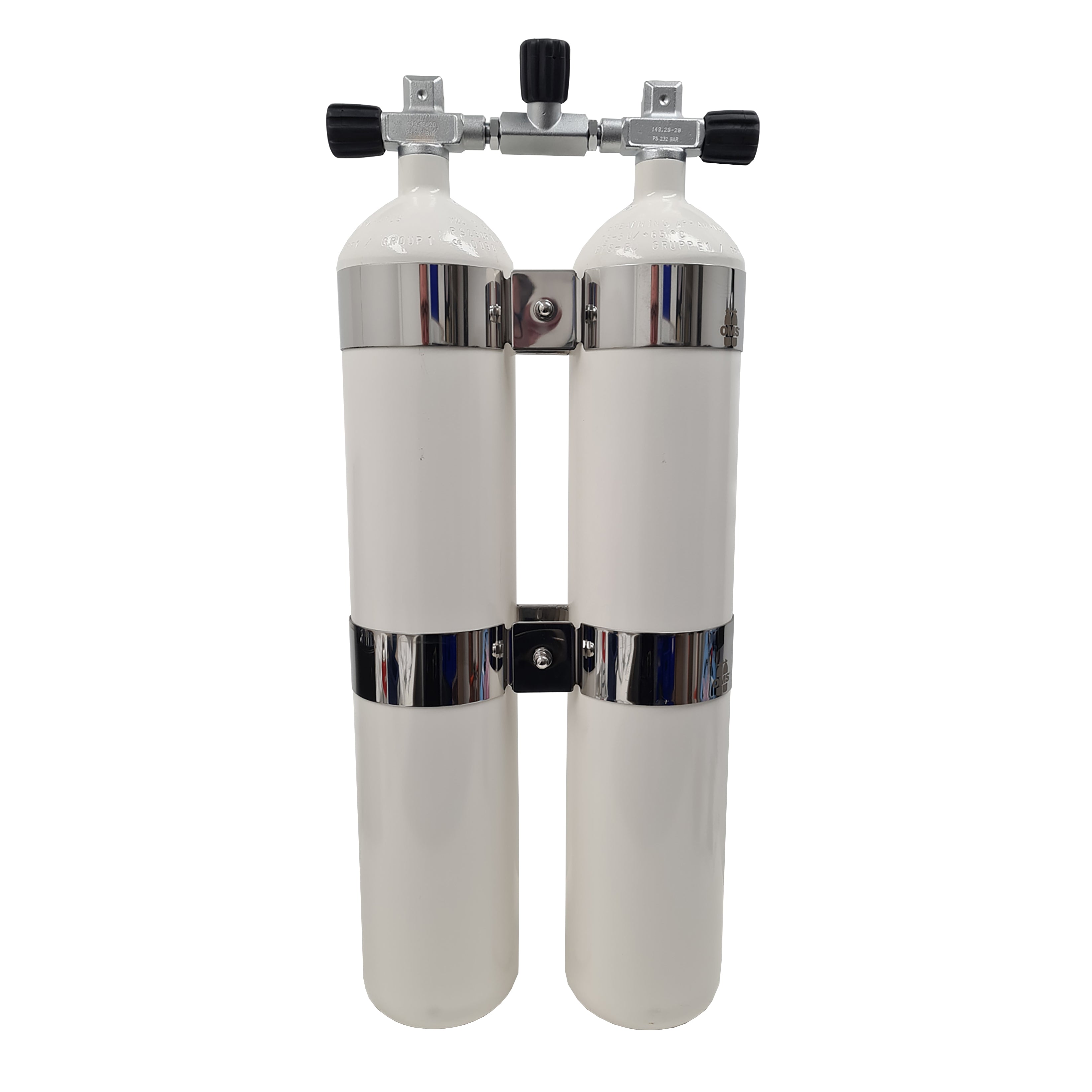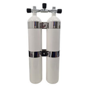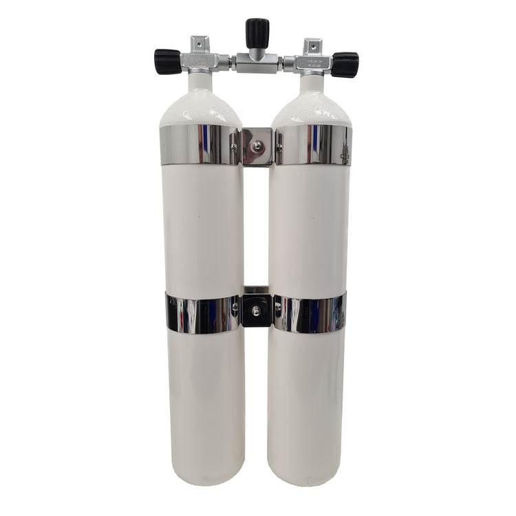 Dobbeltsættet er monteret med kraftige DIR-style bånd i syrefast rustfrit stål og inkluderer en bro med ventil, så de to flasker kan afspærres individuelt. Ventilerne er designet med ekstra langt gummihåndtag for optimal betjening og har standard 5/8" BSP DIN-udtag, mens A-clamp/INT-tilslutning er mulig ved brug af en indsats. Kombinationen af solid konstruktion, fleksibel ventilopsætning og lille tankafstand gør dette dobbeltsæt til et pålideligt valg for seriøse dykkere.
