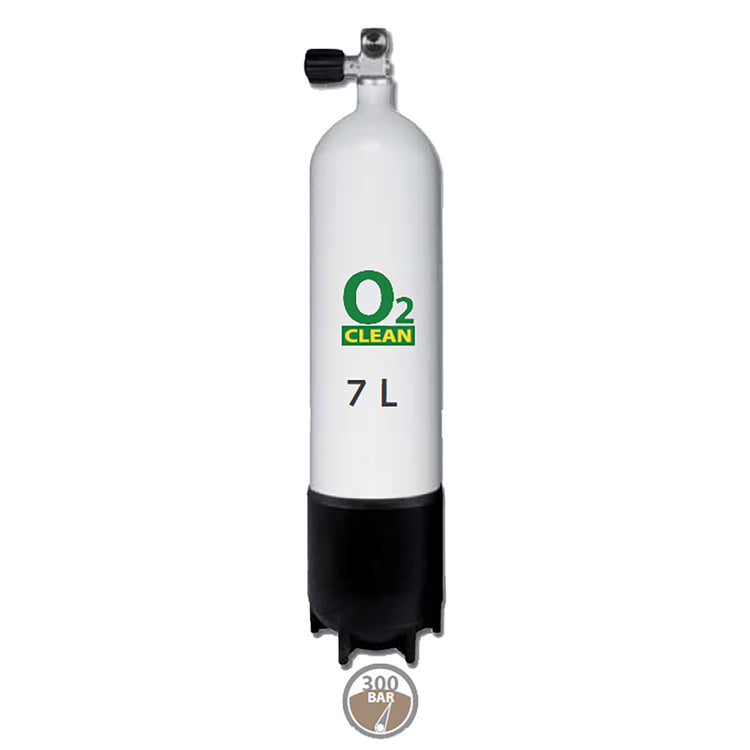 Flasken kommer med en italiensk kvalitetsventil med M25x2 flaskegevind og et 300 bar udtag, kompatibelt med 5/8" DIN-standard. Den leveres med en standfod i slagfast plast/gummi, som giver stabilitet under opbevaring og brug. Ventilen har et ekstra langt gummihåndtag som standard, hvilket gør den nem at åbne og betjene, og udtaget følger DIN300-standarden for fuld kompatibilitet med almindeligt dykkerudstyr.