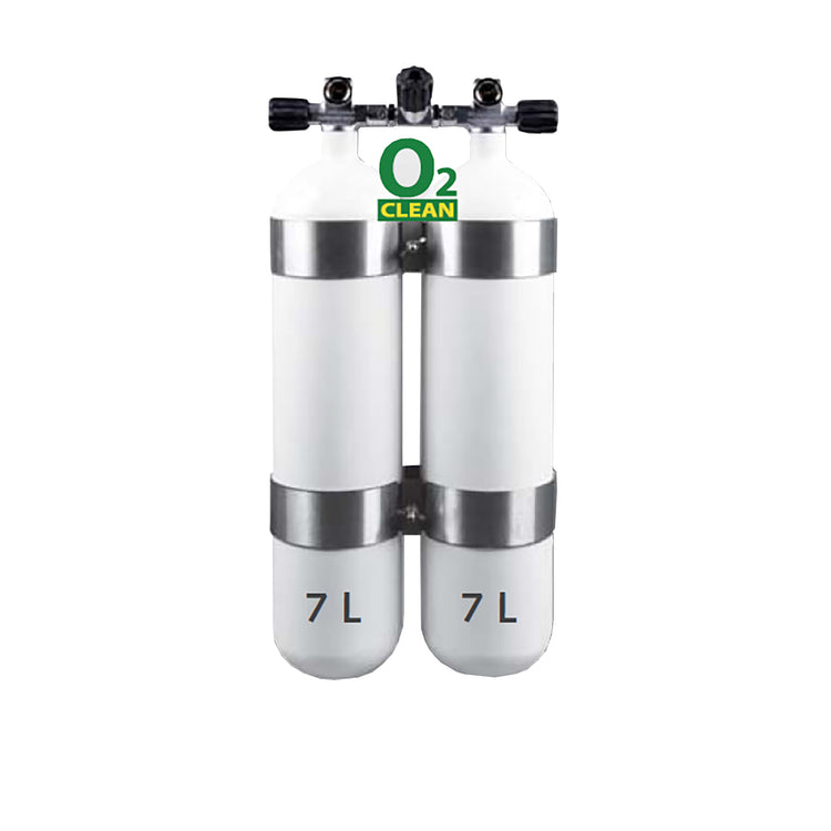 Dobbelsættet består af to flasker forbundet med ventilbro, hvilket giver mulighed for afspærring mellem flaskerne, og begge flasker har 5/8" DIN 300 Bar udtag. Sættet er samlet med kraftige DIR-style tankbånd i syrefast rustfri stål og leveres med ekstra langt ventilhåndtag i gummi som standard. Ventiludtaget er fuldt kompatibelt med 5/8" BSP DIN 300-standard.