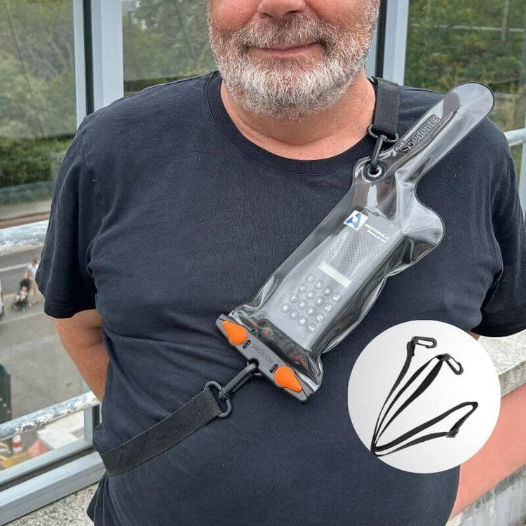 Etuiet leveres enten med en praktisk bæreline. Den passer perfekt til brugere med specialbehov, fx i marinen eller skovvæsenet, og de højfrekvenssvejsede sømme sikrer en ekstremt holdbar og vandtæt konstruktion. Det anbefales at tjekke størrelsesguiden for at finde den bedst egnede model – Mini til små walkie-talkies, Small til de fleste moderne håndholdte VHF-radioer og Large, som denne, til større enheder og satellittelefoner. Den er ikke kun funktionel og robust – den er også et miljøvenligt valg.