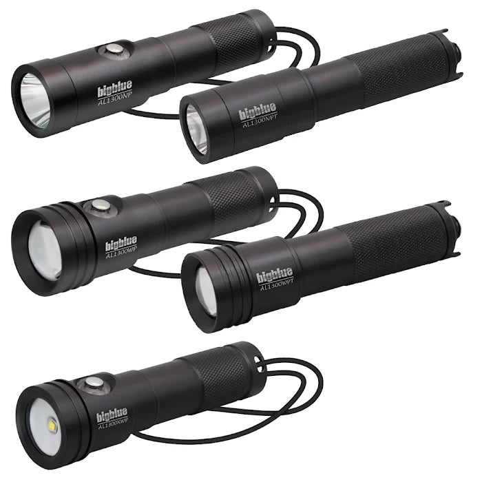 Bigblue AL1300-serien – Kompakte og kraftige dykkerlygter. Lygterne tilbyder høj ydeevne i et kompakt design og er velegnet til både rekreativ dykning, teknisk dykning og undervandsfoto/video. Alle modeller leverer 1300 lumens, har fire lysstyrker + SOS-funktion, batteriindikator, og er vandtætte ned til 100 meter. Med genopladeligt 18650 Li-Ion batteri og smart oplader er du hurtigt klar til næste dyk.