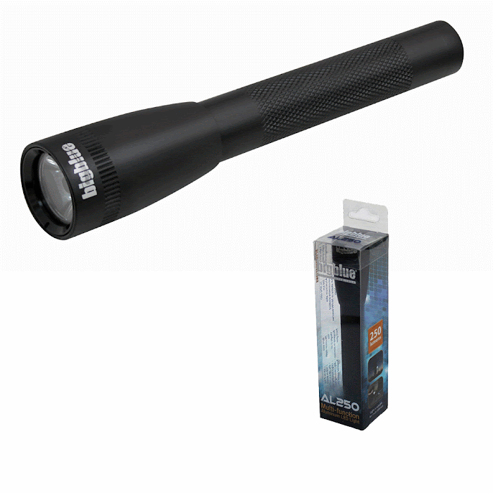 AL250 Multi-function Aluminum LED Light fra Bigblue er en kompakt og alsidig lygte, der egner sig til en bred vifte af aktiviteter både på land og under vandet. Med en lysstyrke på 250 lumen og en farvetemperatur på 6500K leverer den klart og kraftigt solhvidt lys, som er ideelt til dykning, camping, løb, fiskeri og andre udendørs oplevelser. Lygten er bygget i et robust aluminiumshus, som kan modstå hårde forhold under vand ned til 100 meters dybde, og dens lette vægt på kun 135 gram gør den nem at have med overalt. Den drives af to almindelige AA-batterier, hvilket gør den både praktisk og nem at skifte batterier på, når det er nødvendigt.