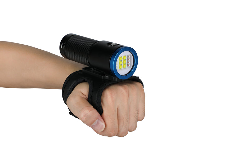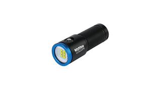 Avancerede lysfunktioner og fleksibilitet. Lampen er udstyret med fire røde LED'er, der forbedrer fokuseringsydelsen, og fire blå LED'er, som er designet til fluorodykning. Med tre lysstyrkeniveauer for både hvidt og blåt lys, samt rødt lys og SOS-funktion, styres det hele let via en pålidelig trykknap med batteriindikator. Dette giver dykkeren fuld kontrol over lyset og mulighed for at tilpasse det til forskellige dykkersituationer.