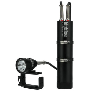Produktet leveres komplet med alt, du har brug for: tre genopladelige batterier, en smart oplader, justerbart Goodman-håndtag, ekstra O-ringe, silikonefedt og en hård opbevaringskasse. Med vægte på 2,3 kg for canisteren og 439 g for lygtehovedet, er vægtfordelingen balanceret, og opdriften er negativ – hvilket gør den stabil og forudsigelig under dyk. De udskiftelige batterier sikrer desuden lang levetid og nem vedligeholdelse, uanset hvor i verden du dykker.
