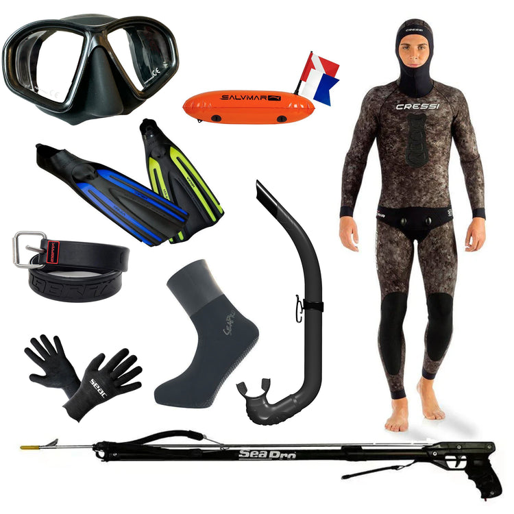 Med denne budgetvenlige udstyrspakke får du alt, du behøver for at tage de første skridt ind i undervandsjagtens verden. Udstyret er valgt med fokus på funktion, sikkerhed og komfort, så du kan føle dig tryg og godt tilpas i vandet. Våddragten beskytter mod kulde og rifter, mens maske og snorkel sikrer klart udsyn og nem vejrtrækning. Harpunen er nem at håndtere – perfekt til begyndere – og den medfølgende bøje gør dig synlig i vandet og giver et sted at hvile udstyret.