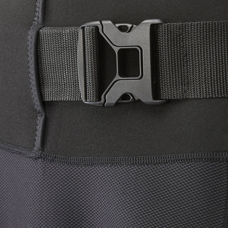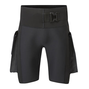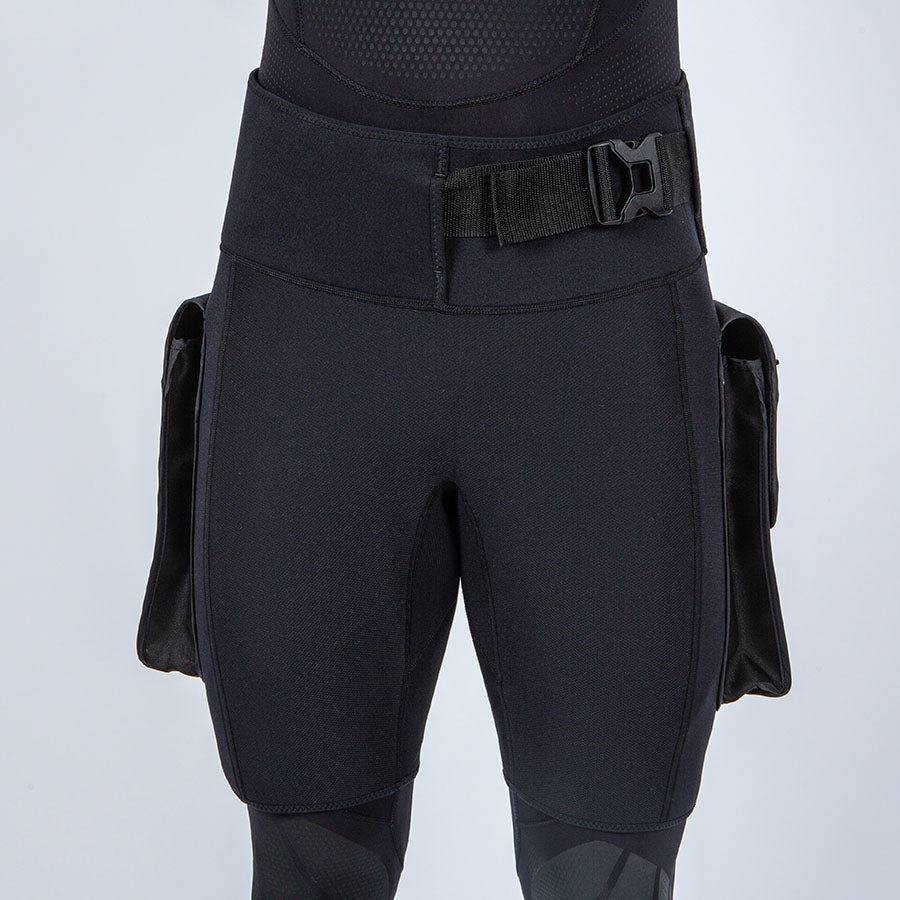 Shortsene har en bred linning med en lavprofils-spænde og justerbart webbing, der sikrer optimal pasform. Indersiden af linningen er foret med et anti-slip mesh, som holder shortsene på plads – både i vandet og under transport til dykkerstedet. Materialerne består hovedsageligt af neopren og genanvendt Supratex, hvilket giver både fleksibilitet og slidstyrke. Modellen er designet til at passe både mænd og kvinder, og det anbefales at vælge en tætsiddende størrelse for at undgå, at shortsene glider ned under brug.