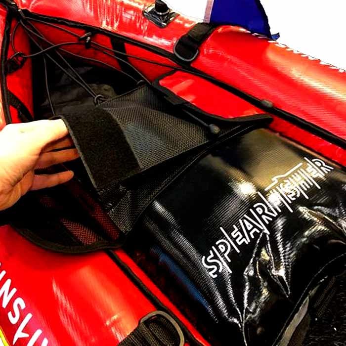Ud over sin robuste konstruktion tilbyder Spearfisher-flåden masser af praktiske detaljer, som gør undervandsjagten lettere og mere bekvem. Den store opbevaringslomme med solid lukning giver plads til alt dit nødvendige udstyr, og fire silikonestropper samt adskillige D-ringe i hård plastik sikrer, at harpun, slynger og andet gear nemt kan fæstnes. Flåden har desuden to håndtag foran, så du trygt kan svømme med den, og bæreseler, der kan monteres, så den kan bruges som rygsæk. Med en vægt på kun 2,4 kg og mål på 65 x 93 cm er Spearfisher-flåden både let og praktisk — det ideelle valg til den seriøse skandinaviske undervandsjæger.