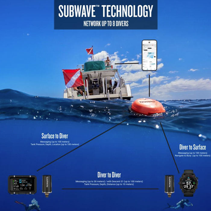 Descent S1 – Kommunikationsbøje fra Garmin. Garmin Descent S1 er en avanceret kommunikationsbøje, der skaber direkte forbindelse mellem dykkere og overflademandskab. Ved hjælp af SubWave-teknologi kan besætningen overvåge op til otte dykkere på én gang og følge både position og vitale data i realtid. Det giver et markant løft i både sikkerhed og overblik – uanset om dykket foregår fra båd eller kyst.