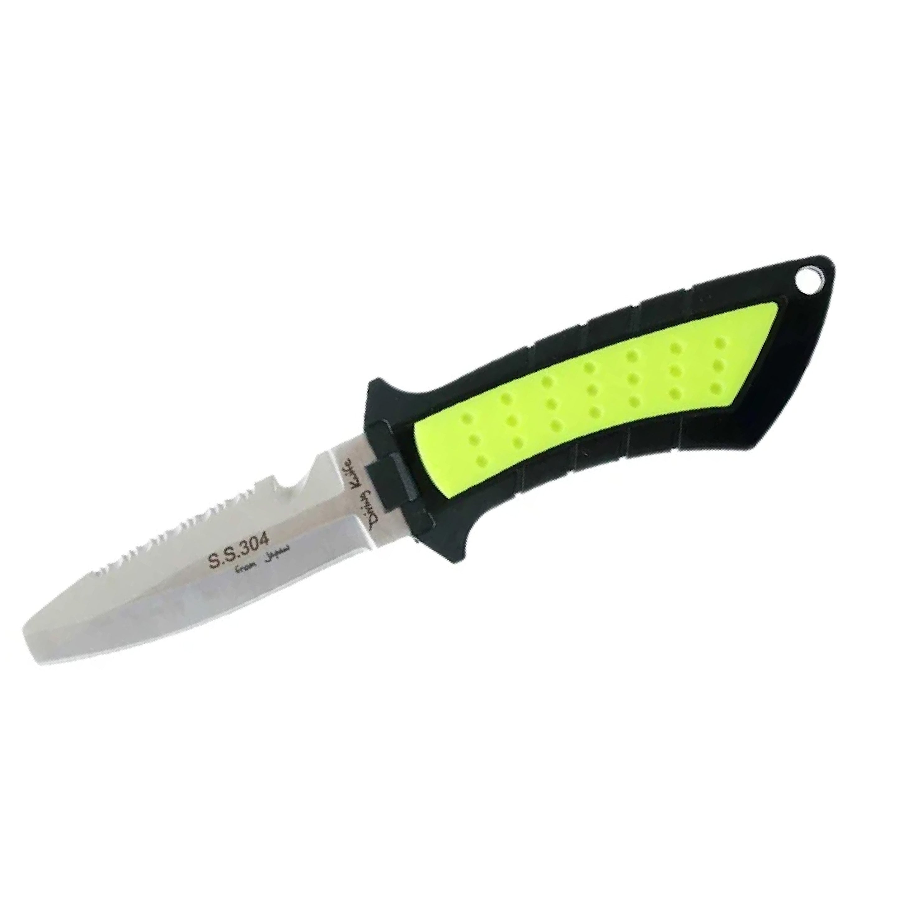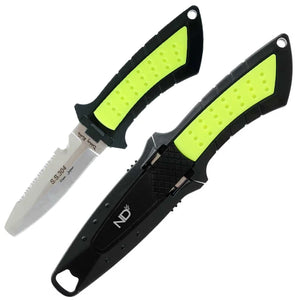 Kniven er fremstillet af 2,5 mm tykt 304 rustfrit stål og har en 70 mm lang, dobbeltægget klinge med både skarp og savtakket kant – samt en integreret line cutter, der gør det nemt at skære igennem liner og net under vand. Den robuste chisel point-klinge er designet med fokus på sikkerhed, især når kniven opbevares i den medfølgende hårde plastskede.