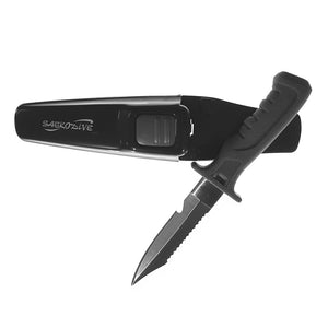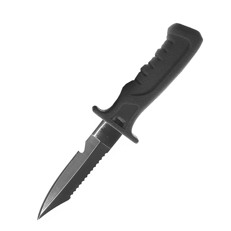 Denne kniv er en kompakt og effektiv dykkerkniv, der kombinerer funktionalitet og brugervenlighed. Klingen er designet med alsidighed for øje: Den ene side har en savtakket æg samt en praktisk line cutter, hvilket gør det let at skære igennem liner, reb eller tang under vandet. Den modsatte side er udstyret med en klassisk glat æg, der afsluttes i en skarp spids – ideel til mere præcise snit eller som værktøj under jagt og fiskeri.