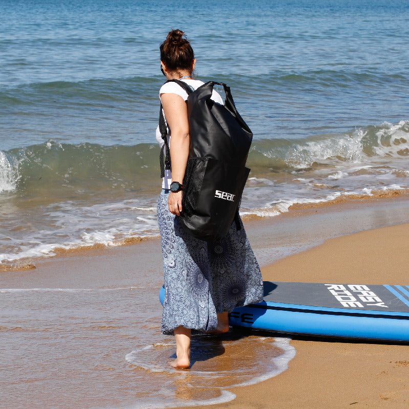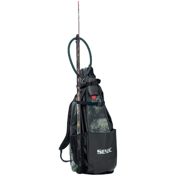 Denne rummelige rygsæk er ideel til undervandsjagt og har plads til alt dit nødvendige udstyr – både stort og småt. Tasken er lavet i slidstærkt, PVC-beklædt materiale, som er vandtæt og modstandsdygtigt over for slid og skrammer. Det store hovedrum er designet til at kunne rumme lange finner, dragter og andet grej, og har dobbelt lynlås for nem adgang. Der er to separate indvendige rum, hvoraf det ene har lynlås og er perfekt til opbevaring af maske, nøgler og andre småting. Ydersiden af tasken er udstyret med to sidelommer med fastgørelsessystemer, der holder dine harpuner sikkert på plads under transport.
