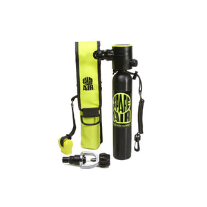 Sættet er let at genopfylde og nemt at dele med en dykkerkollega i en kritisk situation. Den sorte anodiserede aluminiumscylinder passer diskret på din BC og leveres med en standard trykindikator, så du altid kan tjekke luftniveauet. Det inkluderer også et holster med BC-leash, der forhindrer tab, samt en adapter, der gør det muligt at fylde din cylinder direkte fra en SCUBA-tank.