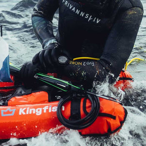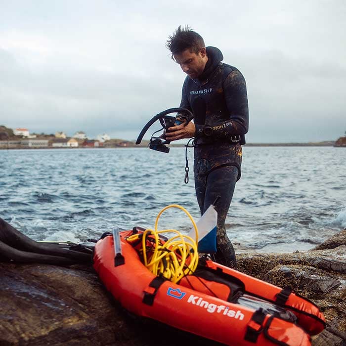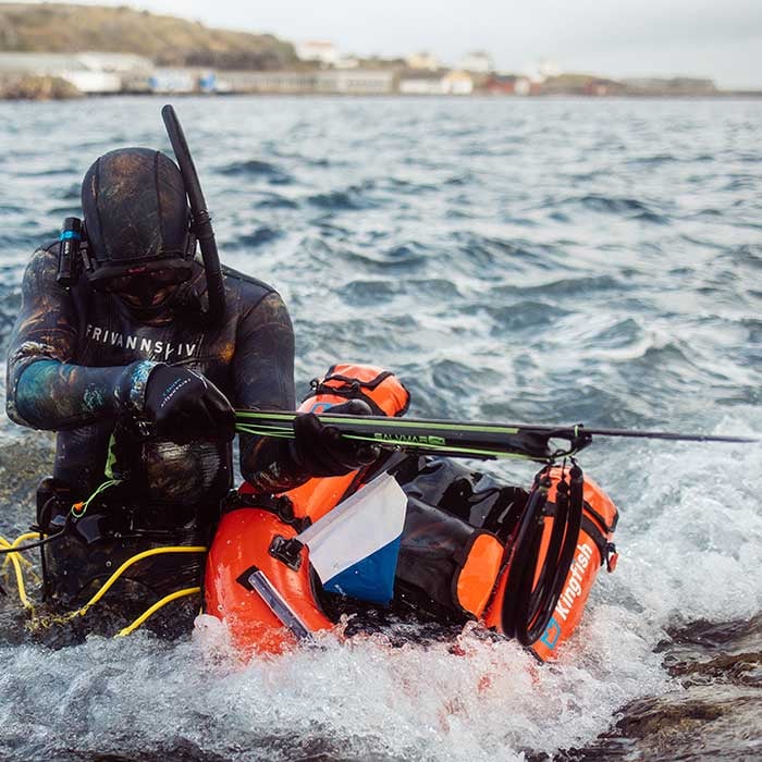 Ud over at fungere som en solid dykkerflåde fungerer den også som en vigtig markeringsbøje. Den øger sikkerheden markant ved at gøre dig synlig for både motor- og sejlbåde samt dine jagtkammerater i vandet. Praktiske detaljer som silikonestropper langs siderne gør det nemt og hurtigt at fastgøre harpuner og andet udstyr. Flåden kan pakkes sammen, så den fylder omtrent som en almindelig skoletaske, hvilket gør den let at transportere til alle dine undervandseventyr. Der findes også en flådepakke med tilbehør som drybag, bøjeline og skulderstropper til nem bæring.