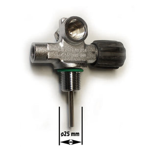 Enkel højreventil til dykkerflasker i høj kvalitet fra Italien, designet med langt gummihåndtag, der giver optimalt greb, selv med tykke handsker. Ventilen er fremstillet i søvandsbestandigt messing med kromoverflade og kan udvides med tilvalg som blind prop, ekstra udtag eller manifold. Passer til både 5/8" DIN og INT indsats (indsats købes separat).